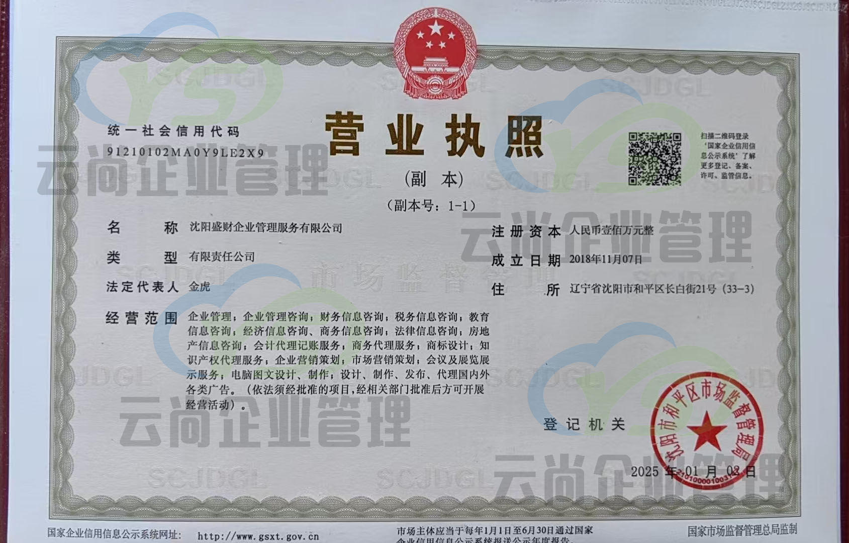 沈阳云尚企业管理服务有限公司是经沈阳财政局和工商局批准的正规的财务管理公司,是集代办营业执照、工商代办、代理记账、财务外包、人事代理等服务的专业公司。公司位于沈阳市铁西区鲁尔大厦。